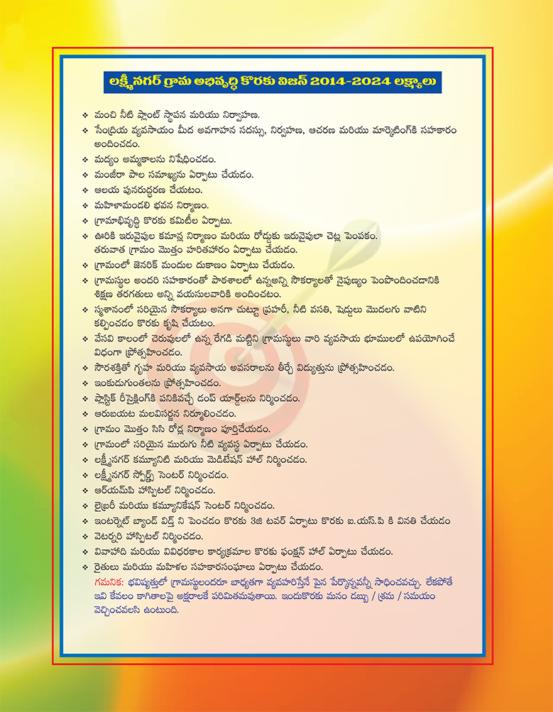 Vision 2014-2024 goals for Laxminagar Village Development:
